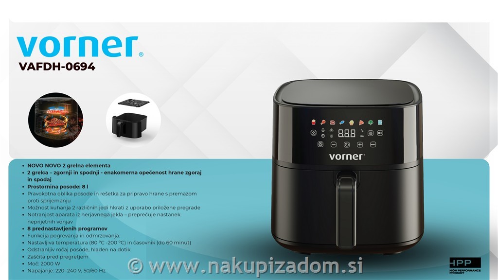 NOVO NOVO cvrtnik na vroči zrak VORNER z 2 grelnima elementoma, za zdrav način priprave hrane brez olja in manjj maščob. Prostornina posode XXL - 8 l z odstranljivo pregrado v košari, omogoča pripravo 2 različnih jedi hkrati. Za lažjo uporabo je že prednastavljenih 8 programov kuhanja + 1 funkcija pogrevanje in odmrzovanje. Preprosto upravljanje ter hiter in varčen način priprave hrane.