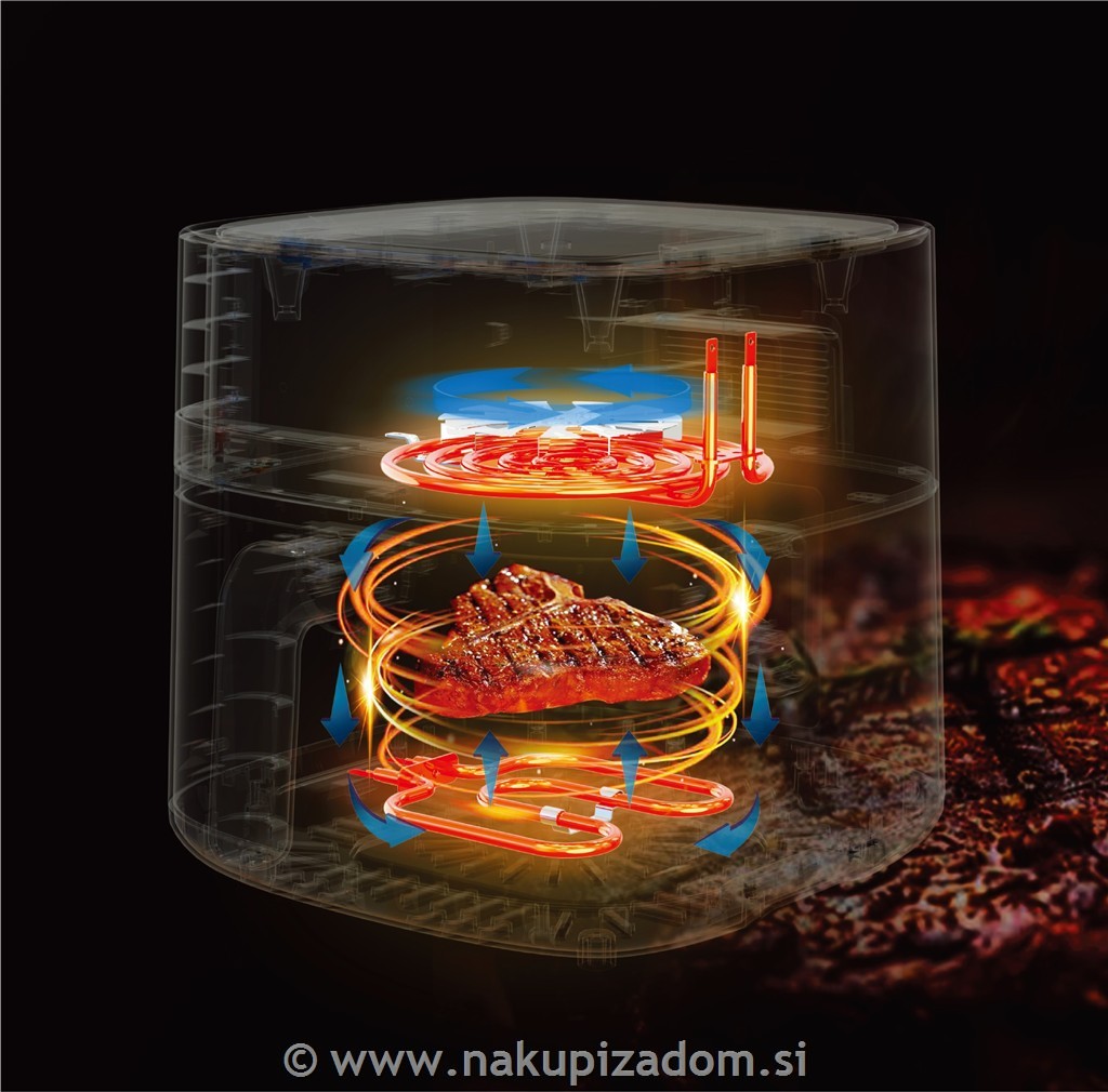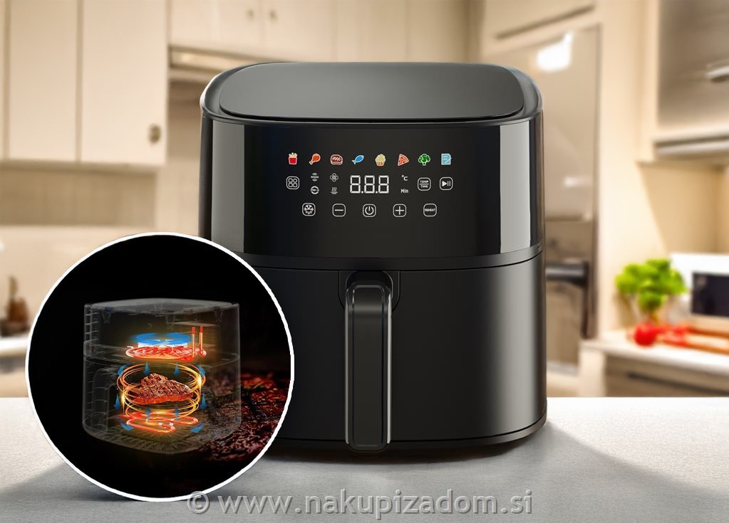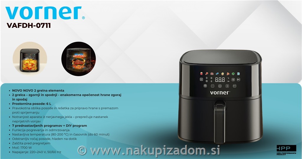 NOVO NOVO cvrtnik na vroči zrak Vorner z 2 grelnima elementoma, za zdrav način priprave hrane brez olja in manjj maščob.Za lažjo uporabo je že prednastavljenih 7 programov kuhanja + 1 DIY. Preprosto upravljanje ter hiter in varčen način priprave hrane.