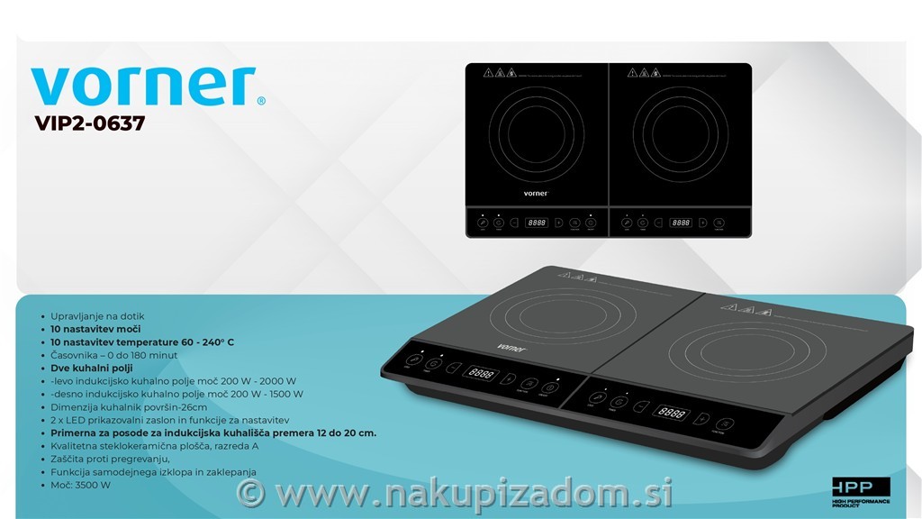 Indukcijski kuhalnik dvojni VORNER VIP2-0637, s skupno močjo 3500W